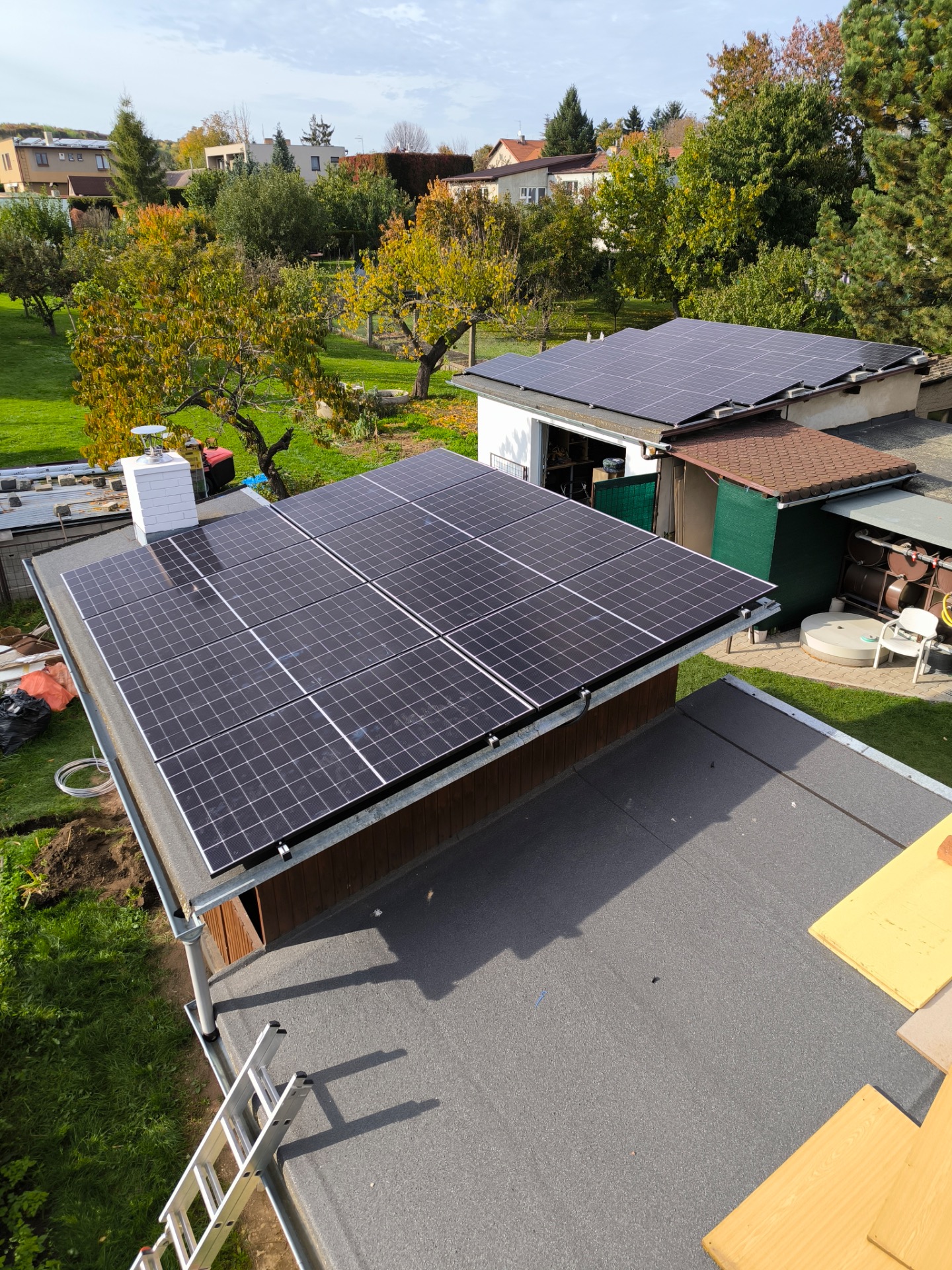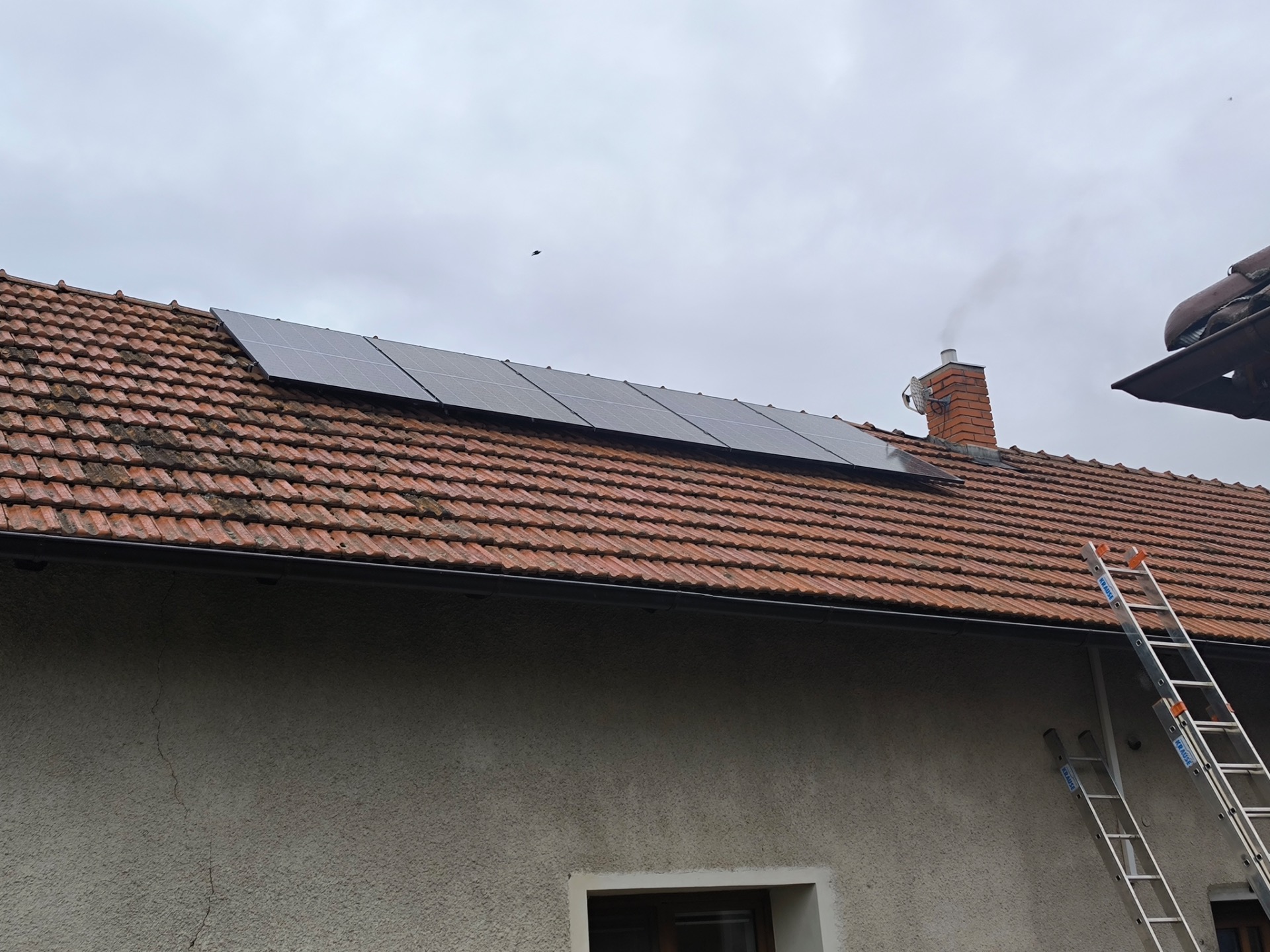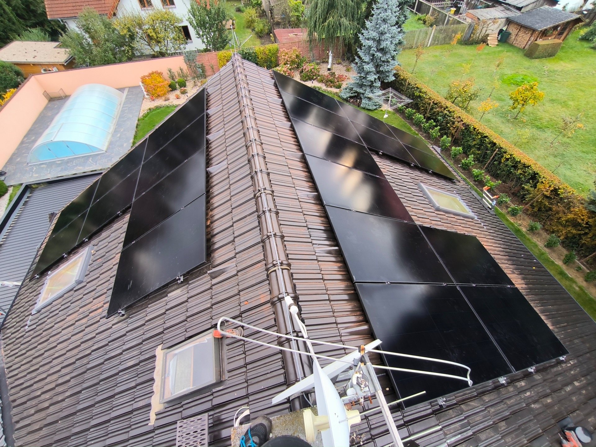 Realizace fotovoltaické elektrárny o výkonu 10 kWp. Pro instalaci byly použity celočerné panely Longi, střídač GoodWe 10KN-ET, bateriové úložiště Pylontech Force H2 s kapacitou 10,65 kWh.