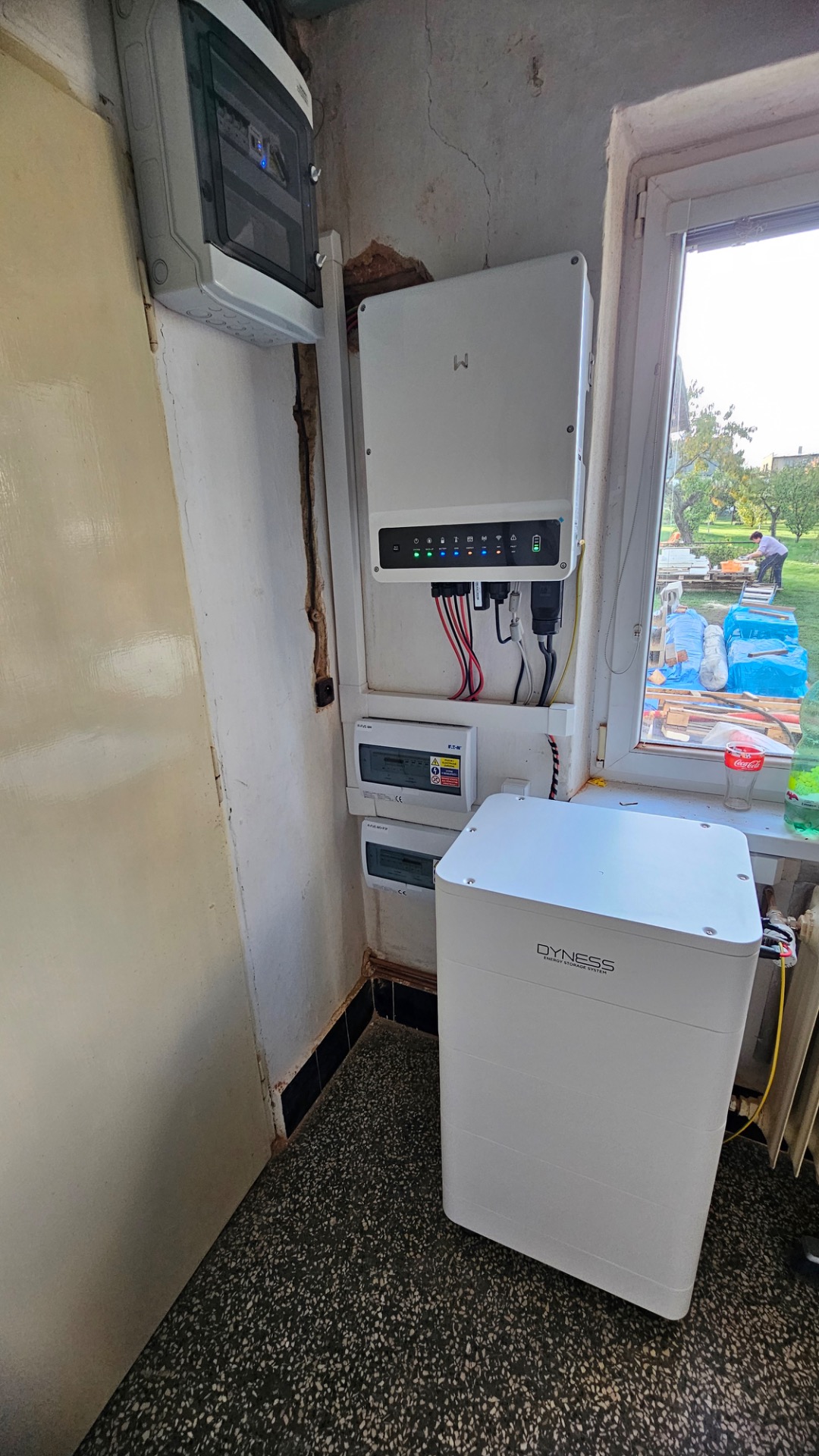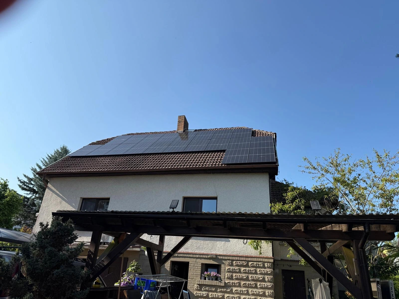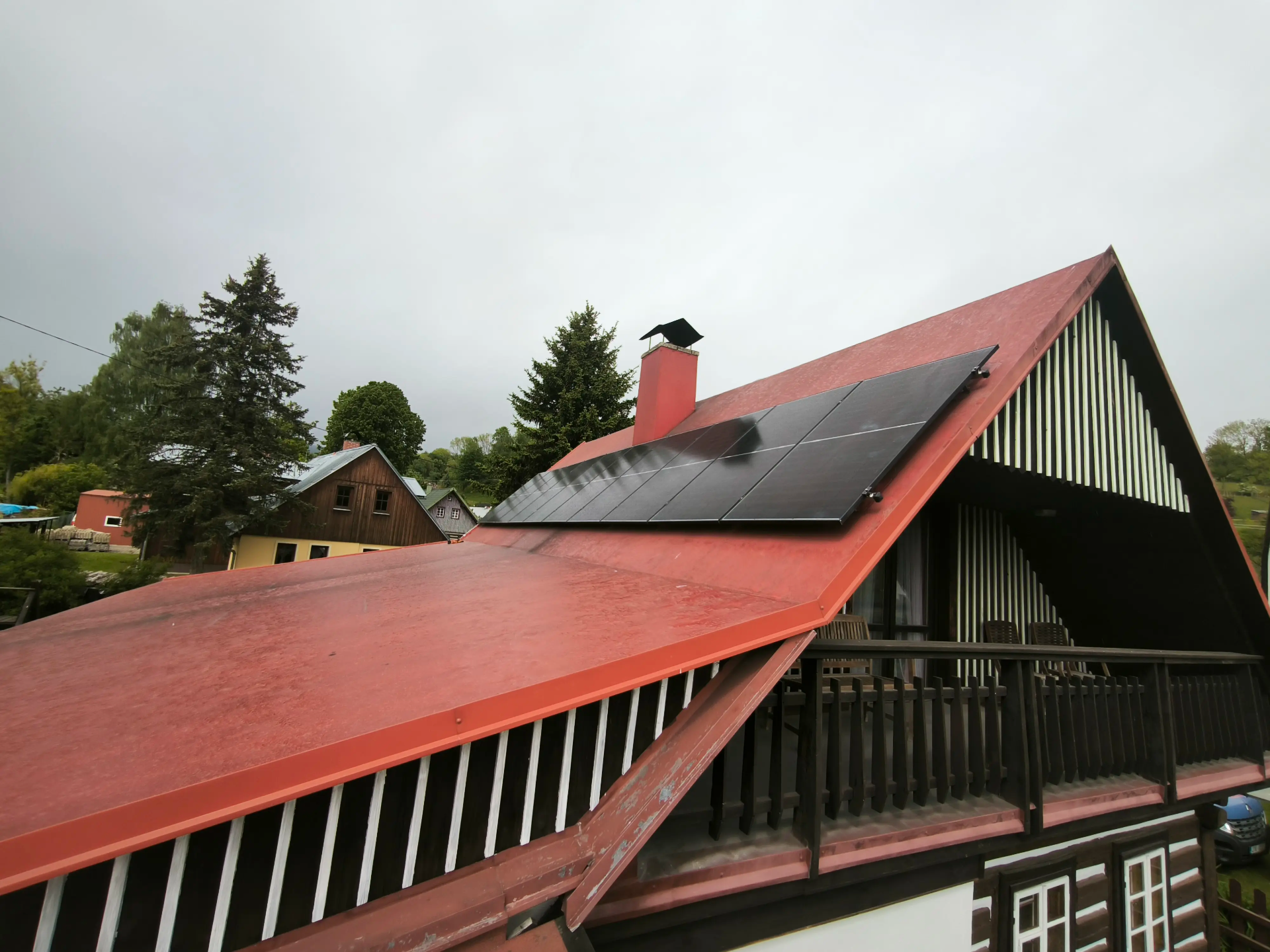 Z důvodu umístění objektu v památkové zóně byly použity celočerné panely DAH Solar 500Wp, dále jsme zvolili střídač GoodWe 10KN-ET a bateriové úložiště Dyness Tower T10 s kapacitou 10,65 kWh.